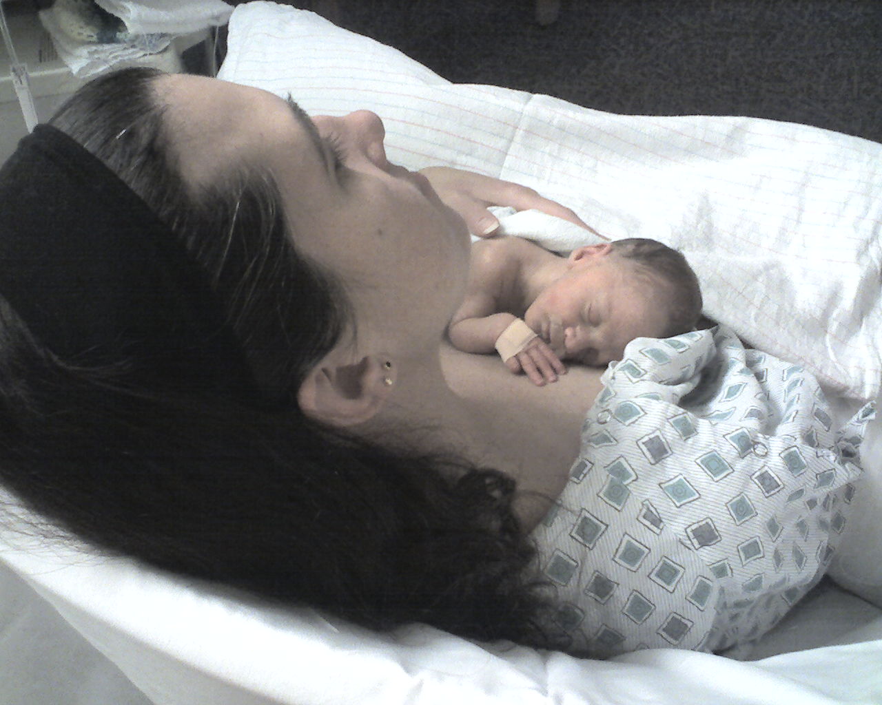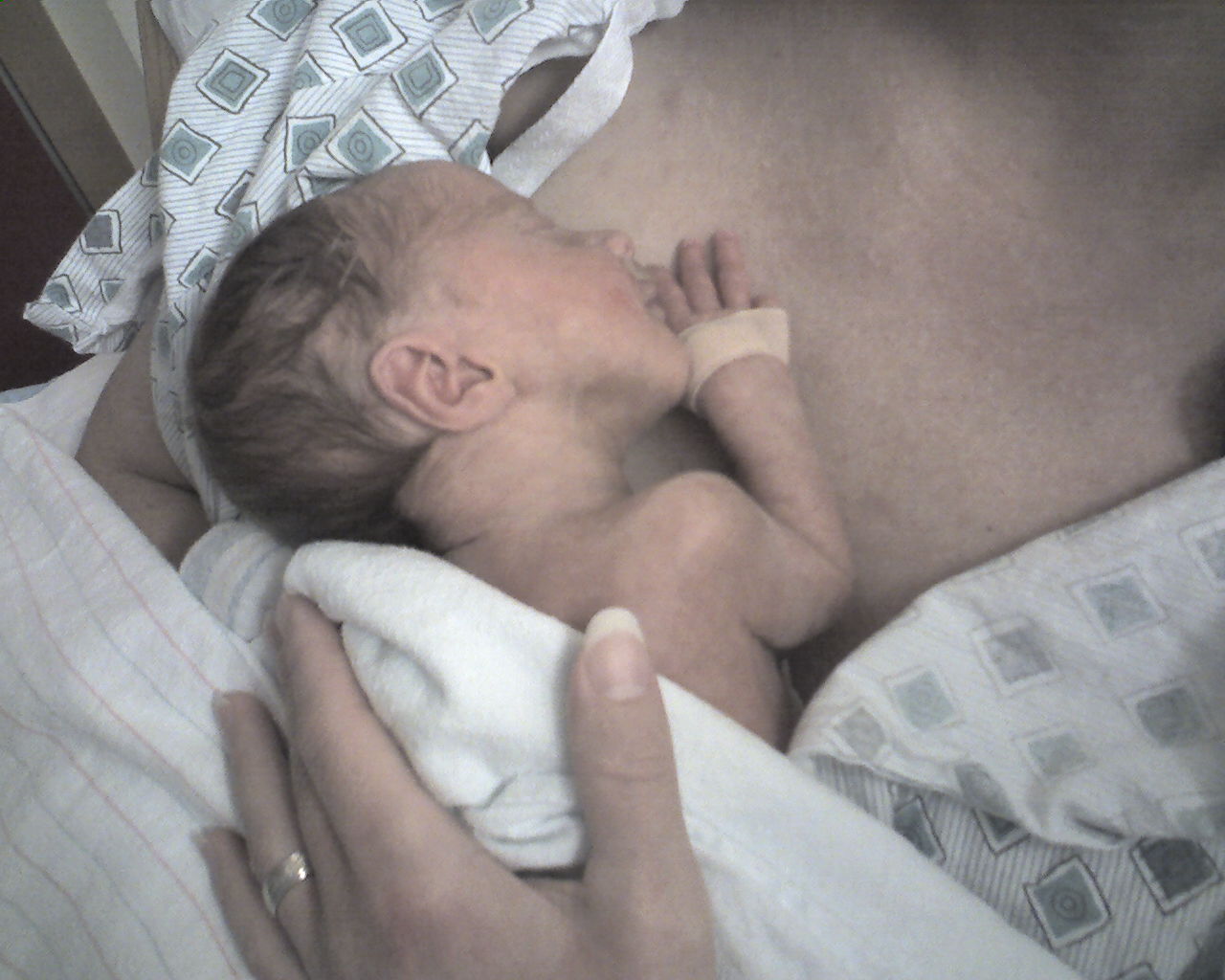 Mom finally got her first session of Kangaroo Care with Aidan. Kangaroo Care is direct skin to skin contact between either parent and baby and it's meant to help with bonding and many health issues. The name is because it's similar to what kangaroos do with their joeys. This method started in 1978, in Bogota Columbia, as a means to keep babies incubated, but they also figured out it helped preemies coordinate their breathing and heart rate, helped them gain weight, helped them have longer and deeper sleep periods, etc. and seriously reduced the mortality rate in countries where health care was slim to none. Since then it's become an accepted practice around the world, becoming popular in the United States since the 1990's for both premature and full-term babies. For various reasons, but mostly because Aidan's time under the lights, we haven't been able to do this previously, but today we got a chance and he was merrily sleeping before the nurse could say "I wonder if we'll need to move him or he'll get comfortable there." It really was amazing. All pictures of Mommy from the front have been excluded because she got comfortable too and looks half asleep, which she was.