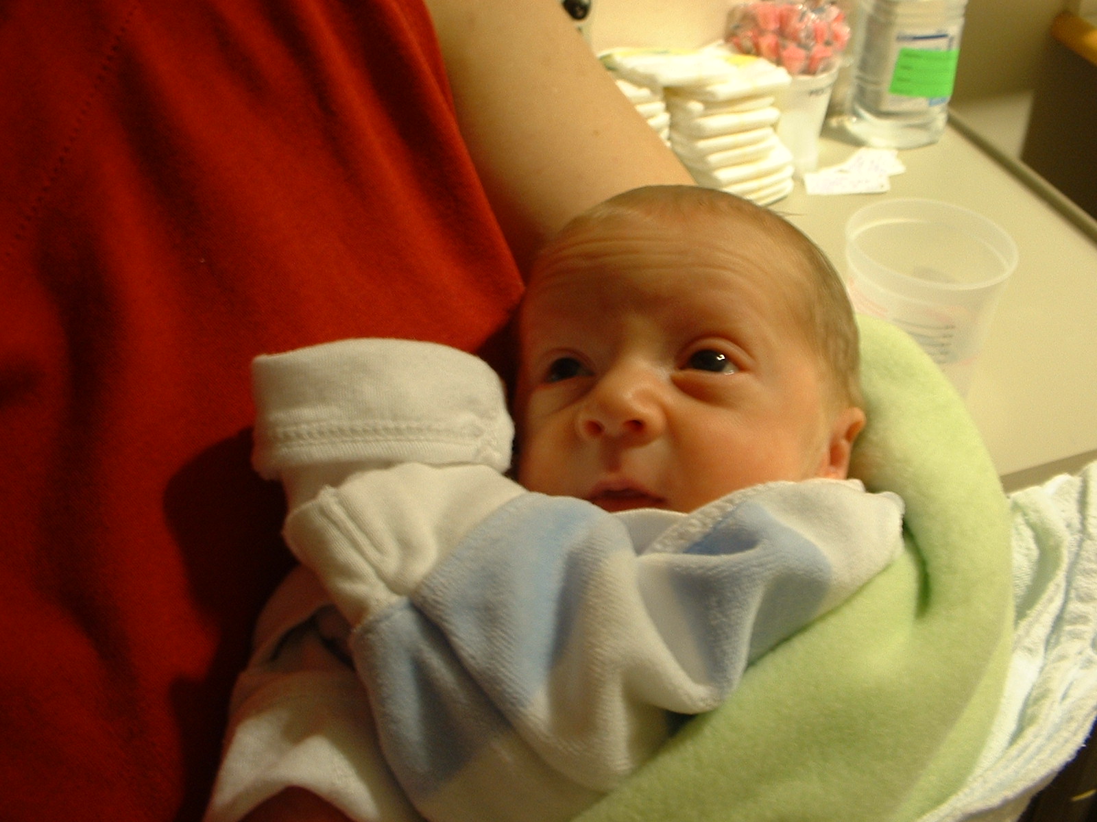 After another frustrating day of monitors screaming and Aidan not taking anywhere near how much food he takes for the nurses, finally the 9 pm feeding went splendidly. No alarms, he stayed awake for the whole thing, and he even did some breastfeeding before he took 50 ml from the bottle. Breastfeeding is a new experience for both mom and Aidan, but he took to it well tonight. Mom and Dad were about ready to jump up and down and run around the ward telling everyone when things went so well. Luckily we didn't, or they might stop thinking of us as the "sane" parents.