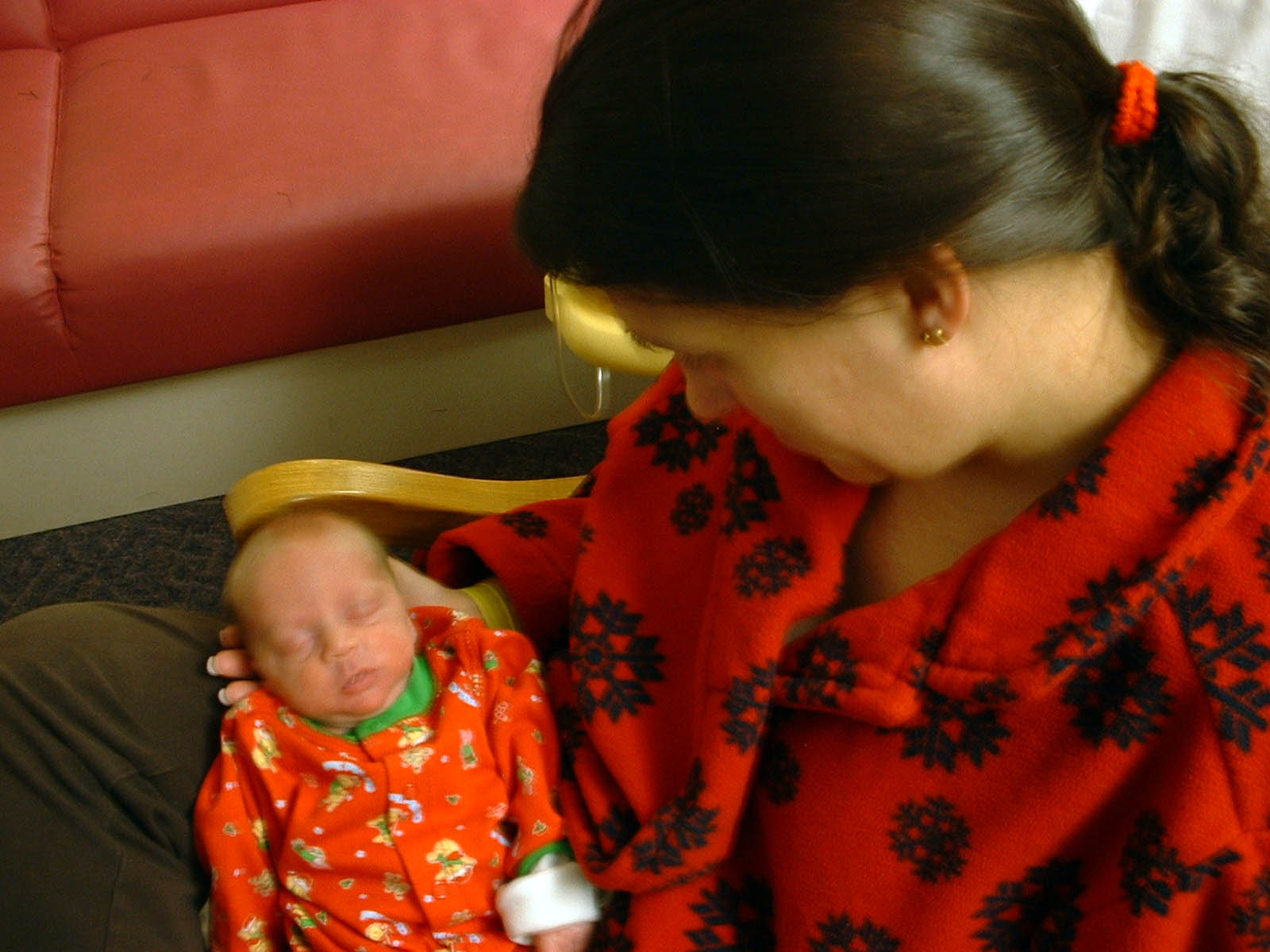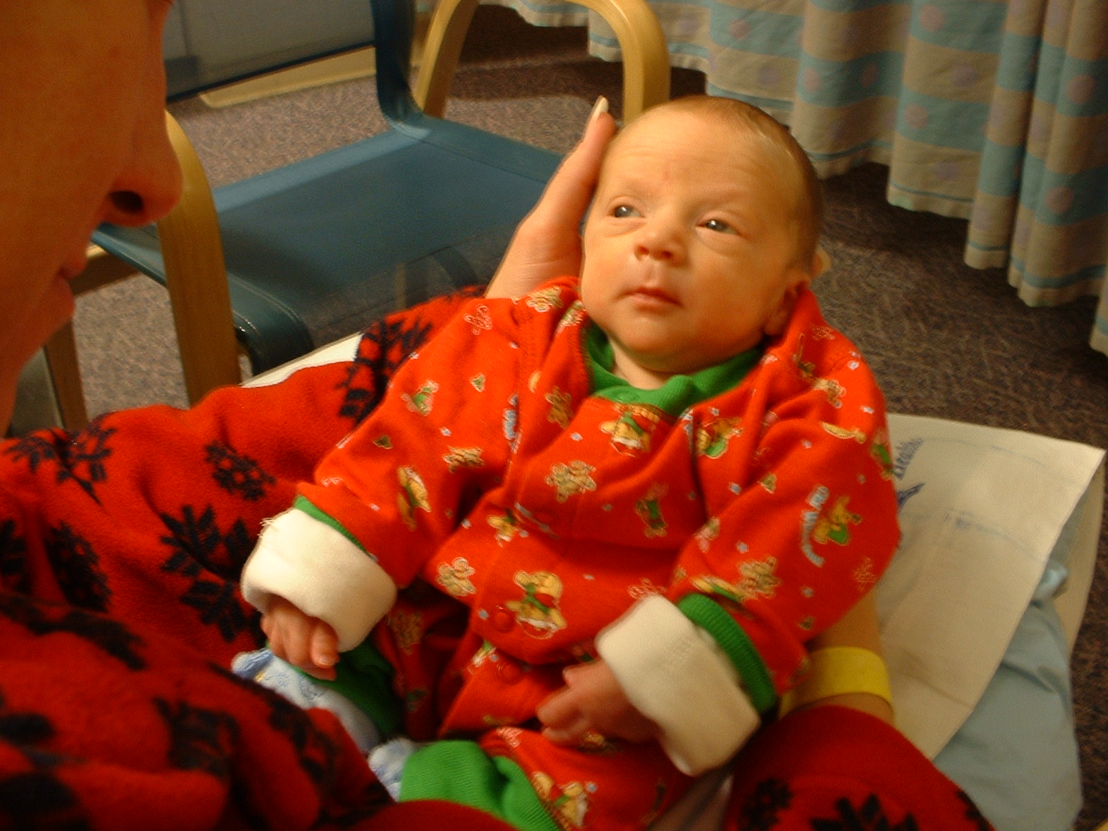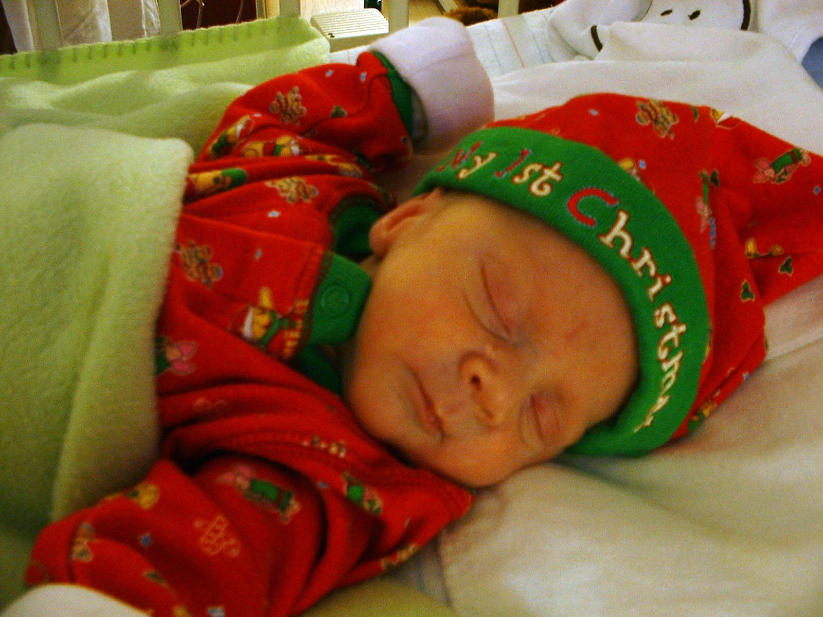 | Day 32 - Christmas Day Aidan's first Christmas - the clothes that Kita, Kitty, Caitlin and Steve sent are a bit large, but they won't fit at all next year so Aidan did his best to make them look good. He likes layering anyway to keep himself warm so he just wore another shirt under everything. The nurses love the hat even though if he's not careful he could pull it down to his chin. Santa visited Aidan's hospital room and left a stocking filled with goodies, a teddy bear, and a new outfit. Quite a lot of stuff for someone so small, but Santa was generous with everyone on the ward. No new updates on progress. Not much has changed with eating/breathing habits, but at least there haven't been any new problems - knock on wood. If we can avoid backsliding, we'll all stay happy. There have been discussions of exit strategy from the hospital, but there are opinions on both sides so we'll wait another day for more details on that. |