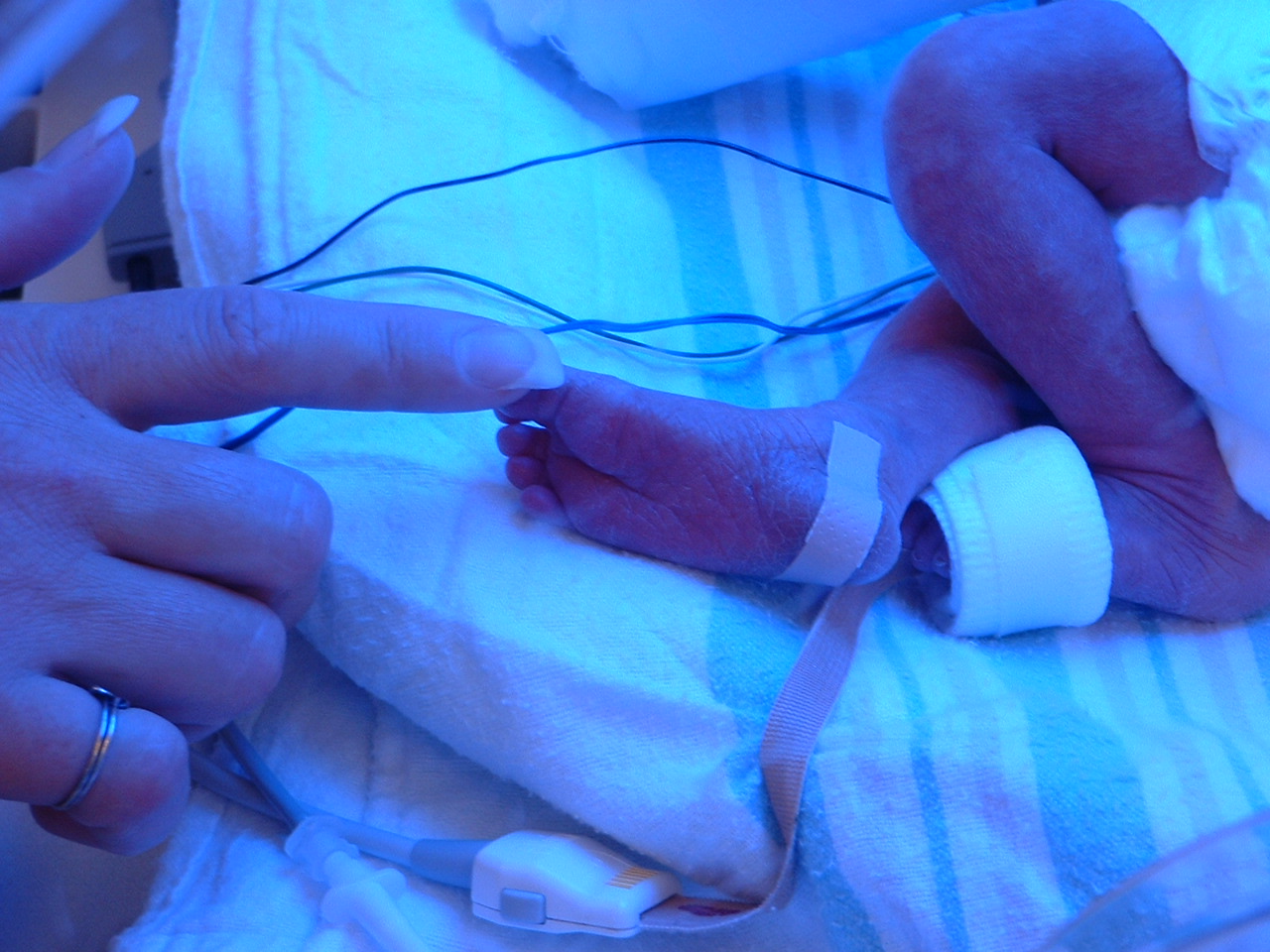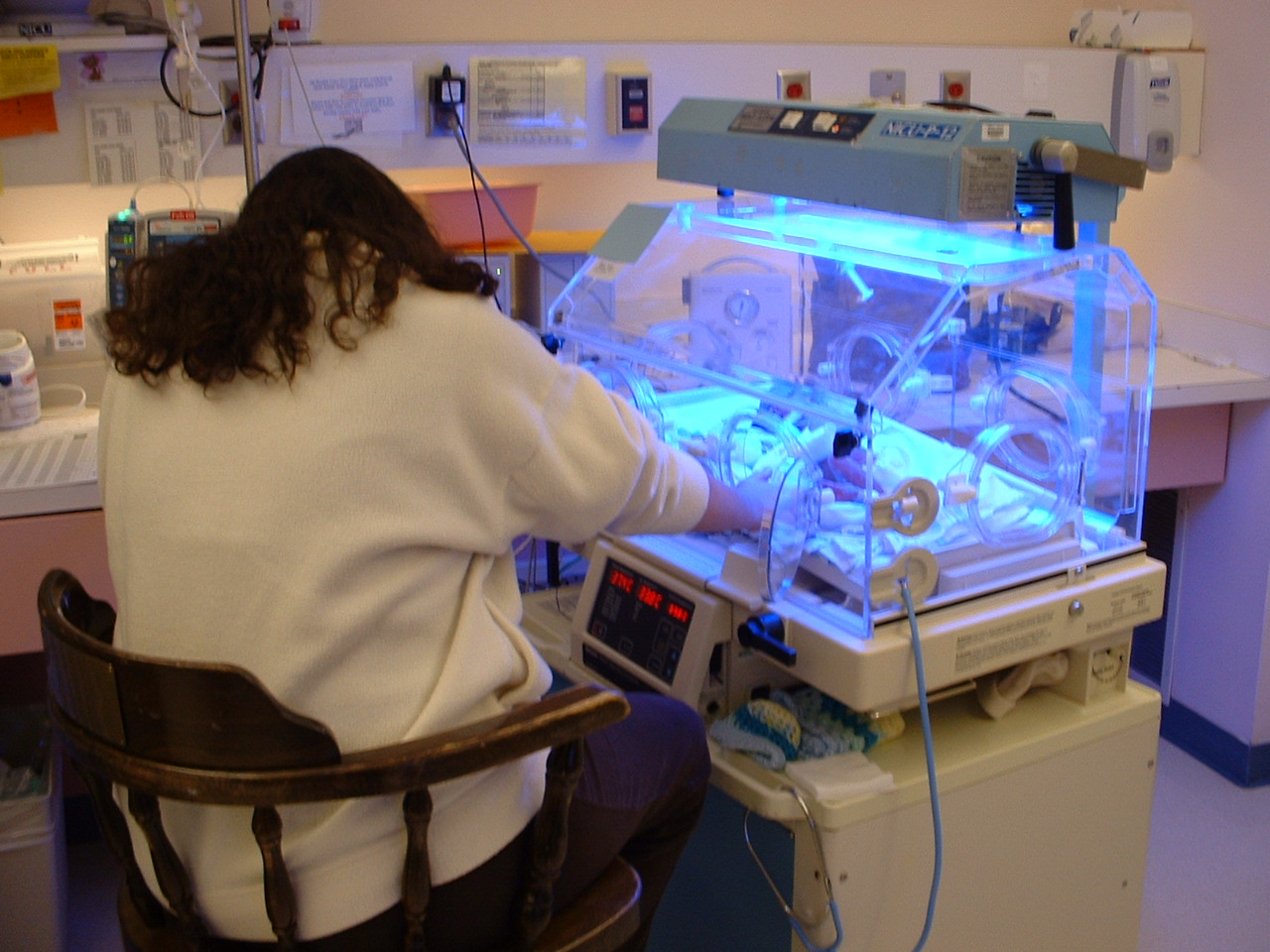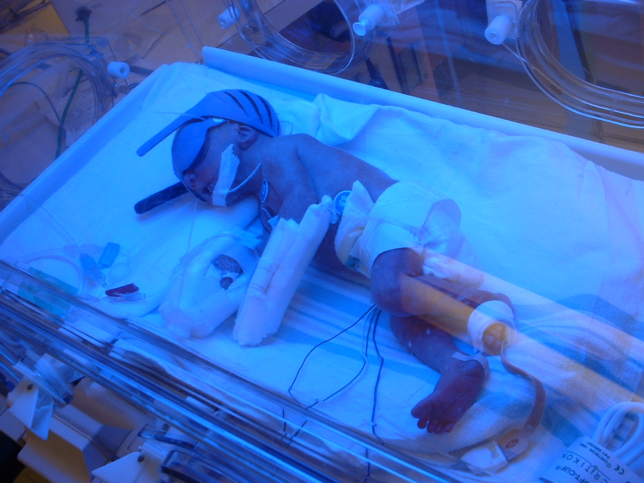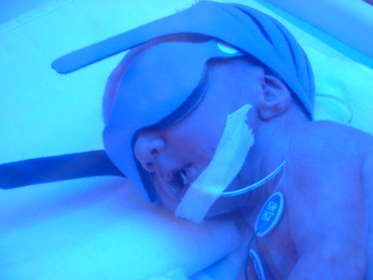 He is also, as you see, getting to work on his tan. The box of blue light is treatment for jaundice. The blood builds up a poison called bilirubin that is normally filtered by the liver. Since preemie's livers generally haven't turned on yet (Mom always took care of that until now!) light of this specific frequency penetrates the skin and helps convert the bilirubin to something they can handle. Aidan's bilirubin levels plateaued almost immediately and should begin dropping now pretty quickly.