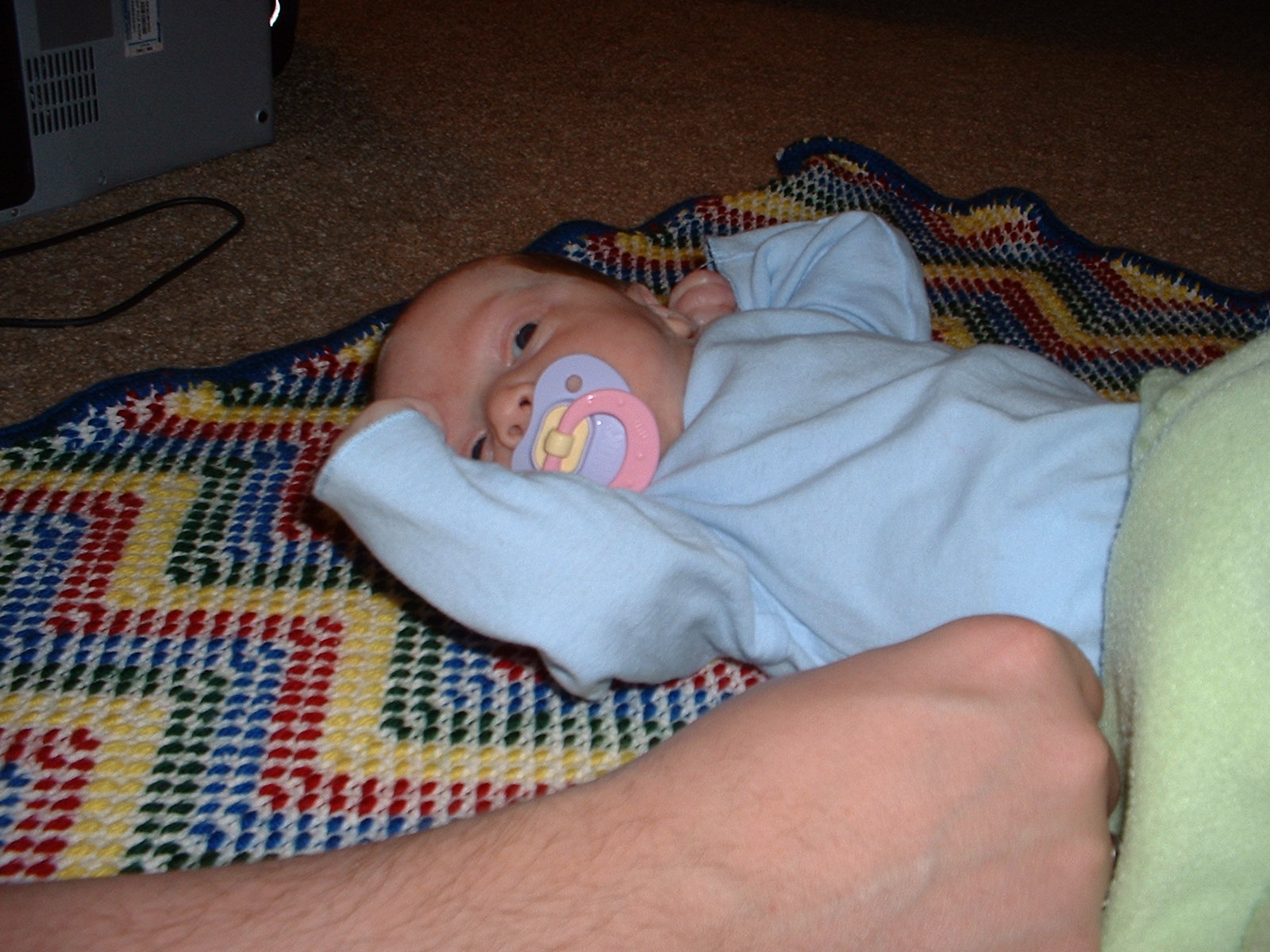 Life is still crazy, but we're enjoying the ride - most of the time. The things we least enjoy are the continuing doctor's appointments. No offense meant to the doctors - we love them and they're doing what's best, but Aidan is getting quite fed up with constant shots. The news from last Friday's blood test was not what we had hoped. Although his red blood cell count is increasing, Aidan is still anemic and needs another round of Pro-Crit shots and another blood test or two. He's also on daily doses of iron which can upset the tummy. He's gotten two shots this week and another planned for tomorrow. We're all hoping this is over soon. Anemia usually isn't considered all that serious in adults, especially if it's a mild case, but evidentally it can negatively affect brain development if not treated in infants.